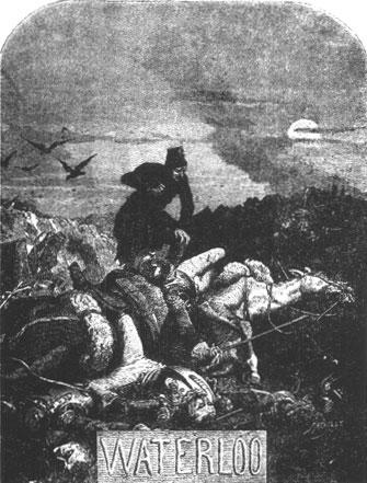 过客抬起头来。他走了几步,从篱笆上面望去。他从树枝中望见天边有一个小丘,丘上有一个东西,远远望去,颇像一只狮子。(那是滑铁卢战场上的纪念墩,墩上有个铜狮子,是英普联军在击溃拿破仑后建立的。)