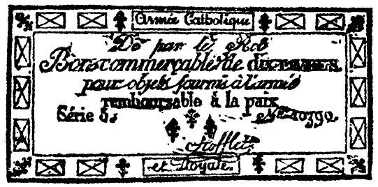 他和老割风一同住在园内的破房子里。那所破屋是用残砖剩瓦搭起来的,一八四五年还在,我们知道,一共是三间,光秃秃的,除墙外一无所有。那间正房,在冉阿让力辞不允的情况下,已由割风硬让给马德兰先生了。那正房的墙上,除了挂膝带和背箩的两个钉子外,只在壁炉上钉了一张保王党在九三年发行的纸币,下面就是它的正确摹本: