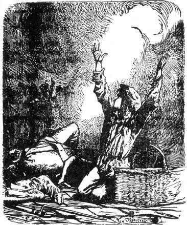 古费拉克坐在安灼拉旁边一块铺路石上,继续辱骂那门大炮,每次随着巨响迸射出被称为霰弹的大量炮弹时,他就用一连串的讽刺话来数落它。