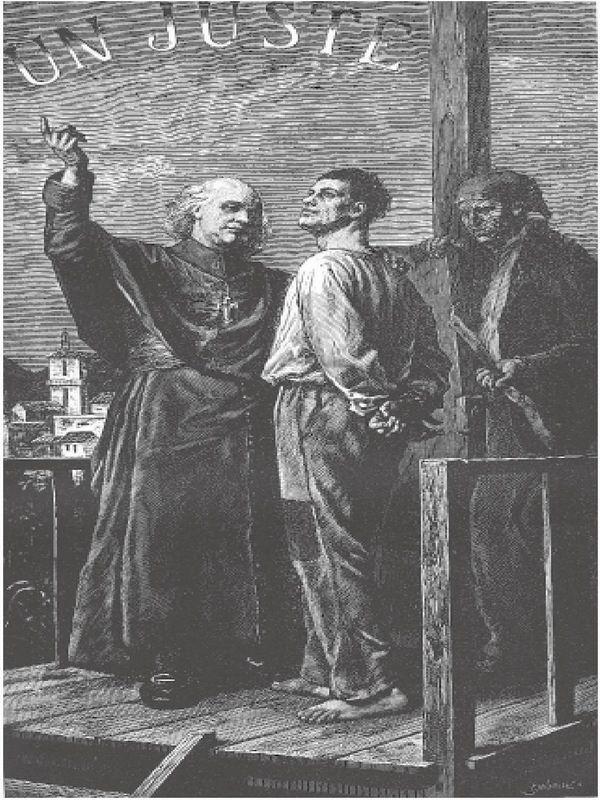 次日来提这个不幸的人时,主教还在牢房里,他也跟着走到刑场。他披着紫色祭披,颈上悬挂着主教十字架,同五花大绑的刑犯并肩站在大众面前。