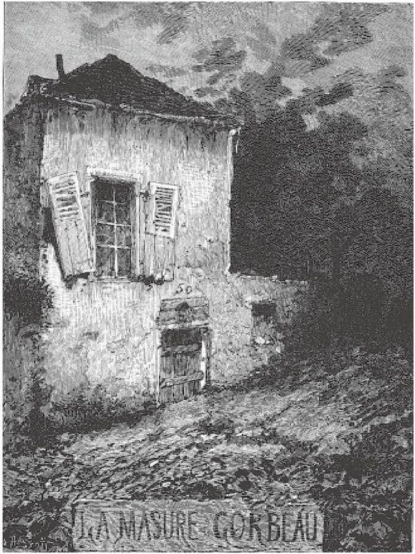 那行人若是信步走过马市的四堵老墙,将右首围着高墙的花园丢在后面,穿过小银行家街,经过一片牧场,只见场上耸立着一垛垛鞣料树皮,好像巨大的水獭窝,再往前走,又见一片围着的空地,里边堆满了木料、树根、锯末和刨花,顶端有一条大狗汪汪狂吠,接着便是长长的一道矮墙,已经颓塌,上面长满青苔,春天还开花,旁边有一扇服丧似的黑色小角门,又经过最荒僻的地段,只见一座破旧建筑的墙上写着“禁止张贴”的大字,他就走到圣马塞尔葡萄园街的拐角,那是很少人知道的地方。在那一座工厂附近,当时还能看到花园两堵墙之间有一所破房子,乍一看像一栋茅屋,而其实有主教堂那么大,因为山墙对着公路而显得狭小。整座房子几乎被遮住了,只能看见房门和一扇窗户。