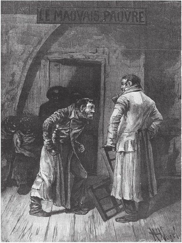 这破屋里只剩下德纳第和被缚人,以及五名强盗。这几个人脸上戴着面具,或者抹了黑胶,装扮成煤炭工、黑人或者鬼怪,借以吓人,然而他们那种样子,又迟钝又没精神。让人感到他们做案犯罪就像干活计,不紧不慢,既不气愤也不怜悯,只是有点无聊。他们挤在一个角落里,一声不吭,好似一群没开化的人。德纳第在烤脚。被缚者重又陷入沉默。这间破屋刚才喧哗鼓噪,沸反盈天,现在忽然平静凄清了。
