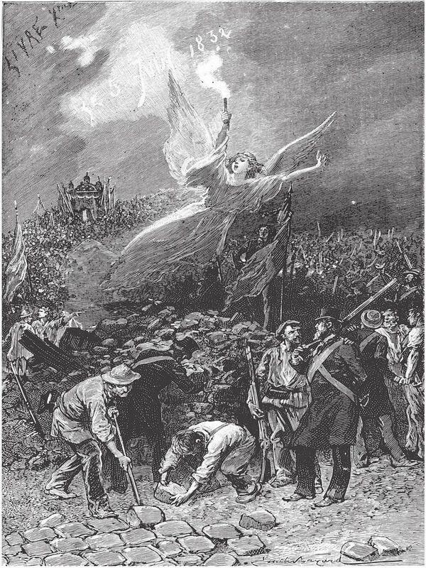 且说6月5日这天,时而下雨,时而出太阳,拉马克将军的出殡队列穿行巴黎,动用了正规的军队仪仗队,并为预防不测而增加了一点兵力。护送灵柩的有两个营官兵,军鼓都披着黑纱,枪口朝下背着枪;还有挎着战刀的一万名国民卫队队员,以及国民卫队的炮队。灵车由一队青年拉着行进,残废军人的军官手持月桂树枝,紧紧跟在后面。随后便是浩浩荡荡的群众队伍,乱纷纷,闹哄哄,一个个神态怪异,有人民之友社成员、法学院和医学院的学生,还有各国的流亡者,打着西班牙、意大利、德国、波兰等国旗帜,还打着横条三色旗,以及五花八门的旗号,孩子们挥动着青树枝。石匠和木匠这时候也罢了工,有些人头戴纸帽,一看便知是印刷工人,他们三三两两,边走边叫喊,几乎每个人都挥舞着棍棒,有几个人还挥舞着战刀,队伍时而混乱,时而成行,没有秩序,但是却万众一心。一伙伙人自行挑选出头头;一个公然别着两把手枪的男子,仿佛在检阅其他人,而队列在他面前都自动闪避。在大马路的横街,只见树上,阳台上,窗口,屋顶上,人头攒动,有男人、妇女和儿童,他们眼里充满不安的神色。武装起来的群众走过,惊恐不安的群众观望。
