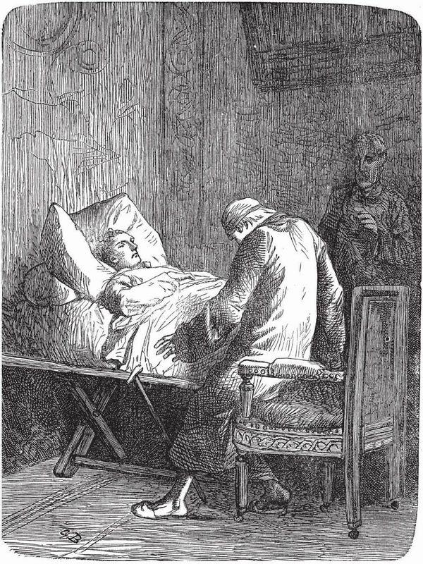 马吕斯刚到时安置在长沙发上,毫无知觉,继而又被巴斯克和门房抬进客厅。去请的医生赶来了。吉诺曼姨妈也已起床。